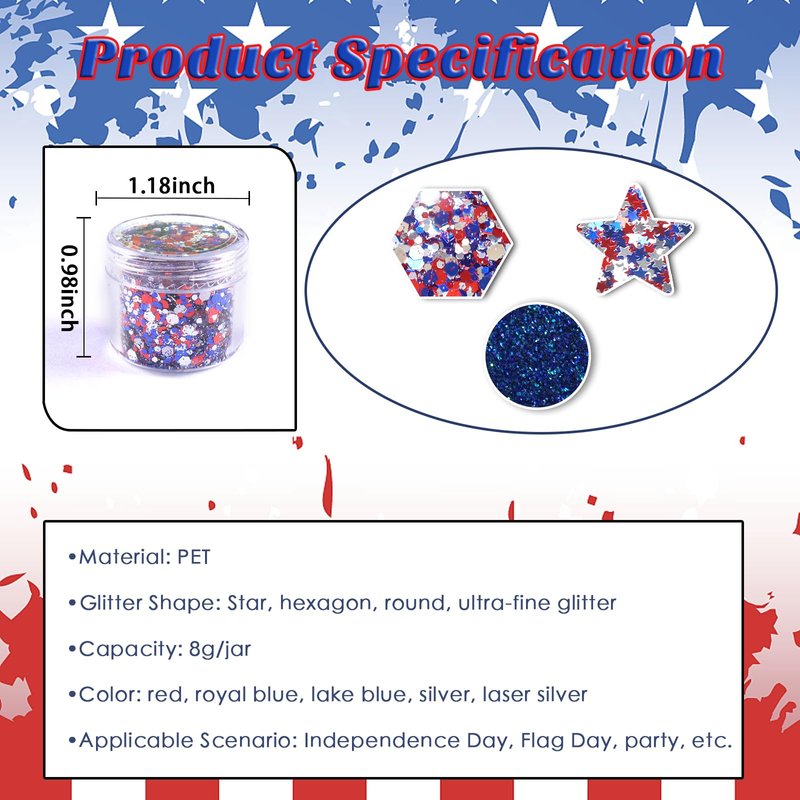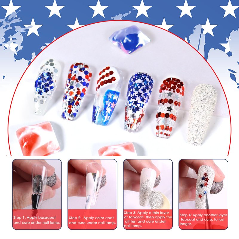 - Various Shapes: There are 4 jars of chunky hexagon sequins, 4 jars of star sequins, 2 jars of medium sized hexagon sequins, and 2 jars of fine glitter. Colors and shape of this 4th of July nail confetti kit is perfect for making American flag nails. You can mix and match theme colors and effects in any combination.