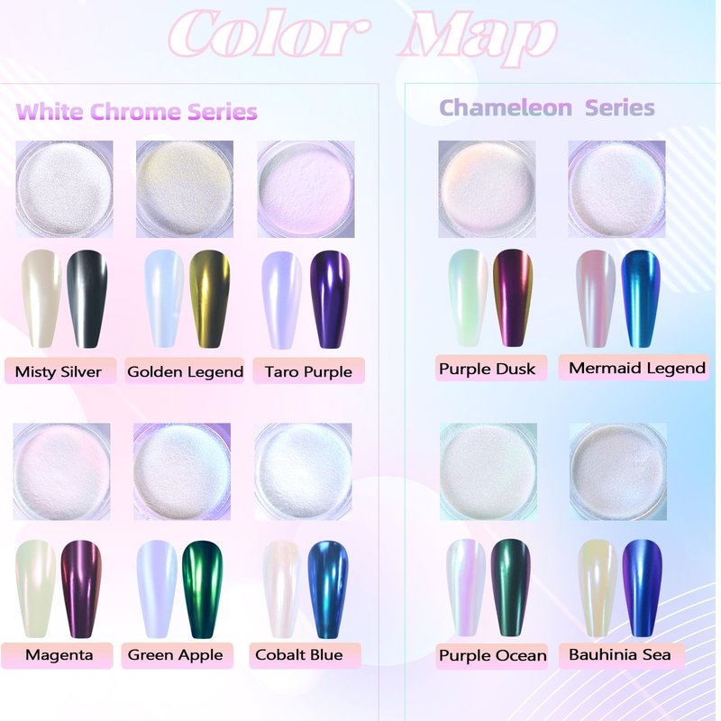 - Wide Application: The pigment powder for nails is suitable to be applied on both acrylic nails and natural nails. It can also perfectly match with chameleon flakes, nail charms, water ripple pattern, French manicure, 3D nail art and etc. Just unleash your creativity.
