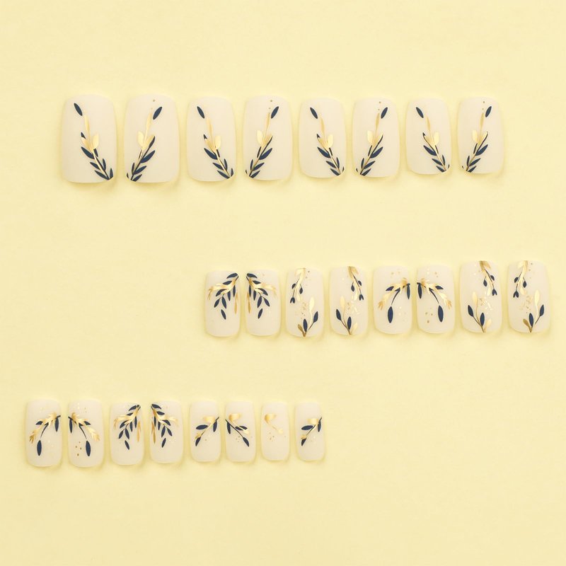 24Pcsgold blue leaves Press On Nails Medium Square Fake Nails for Women Girls Nail Art Decorations.