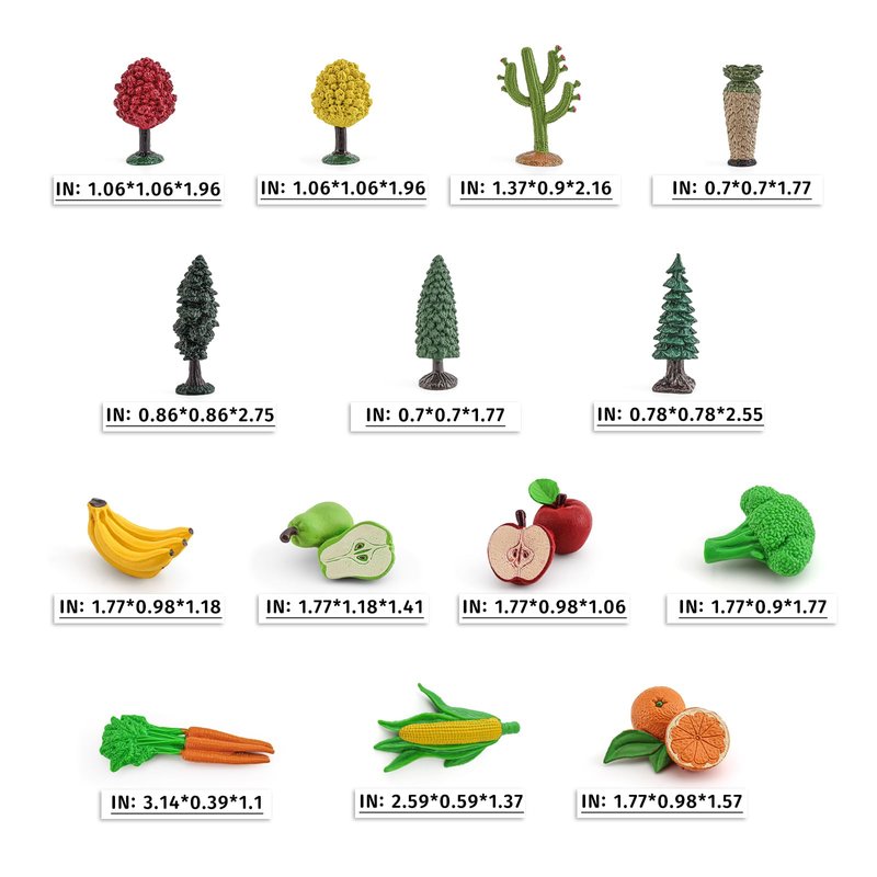 - WHAT'S INCLUDE - 16PCS Mini farm animals figures set.Include oranges,bananas,apples,pears,carrots,broccoli,corn,and artichokes,pine,elm,juniper,topiary,petticoat,aspen,and 2 maples.Kid can use these plastic animals farm toys to build their own farm up.Farm sets for kids can bring happy.