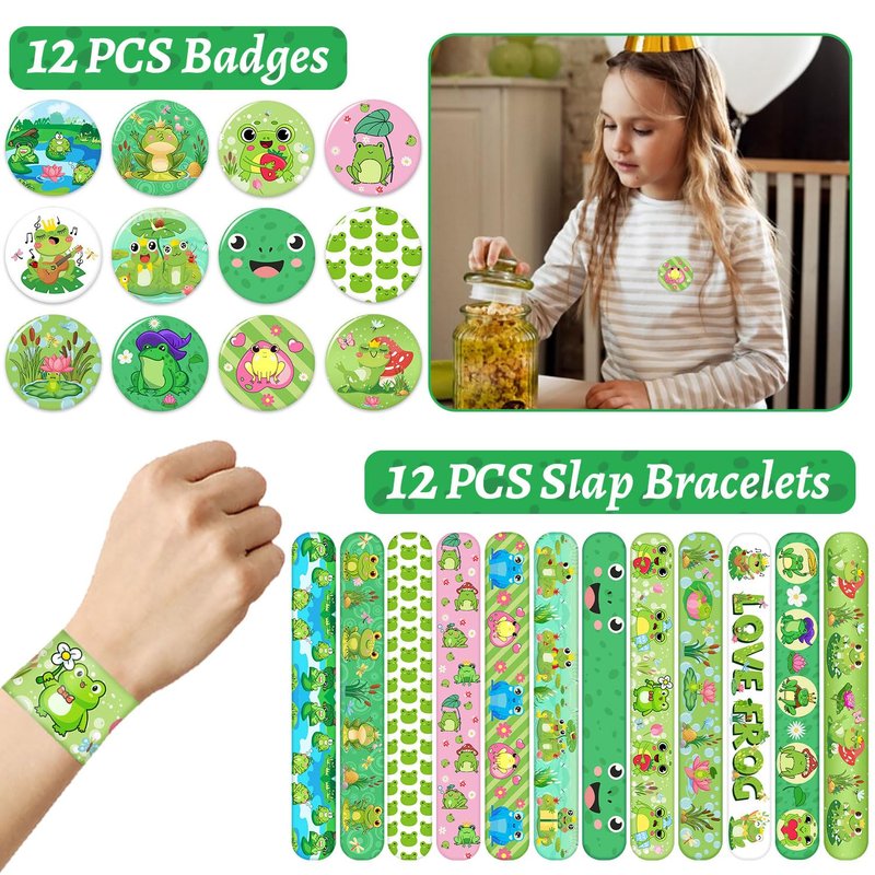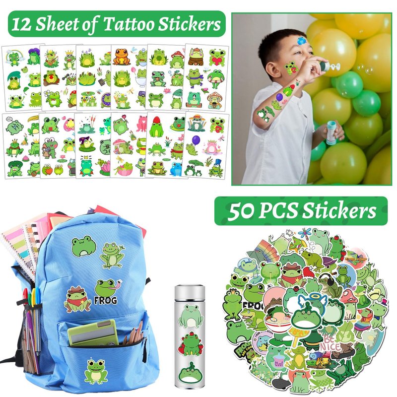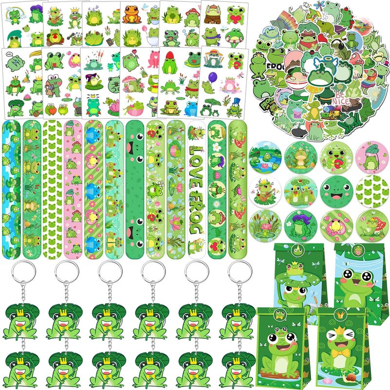 - Package Include: The frog party favors contain 12 sheet frog temporary tattoos, 12 pcs frog slap bracelets, 12 pcs frog keychains, 50 pcs frog stickers, 12 pcs frog badges, 12 pcs frog gift bags in two styles (with different patterns on the front and back), Enough quantity to meet your frog party needs