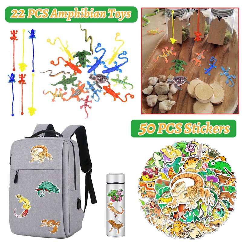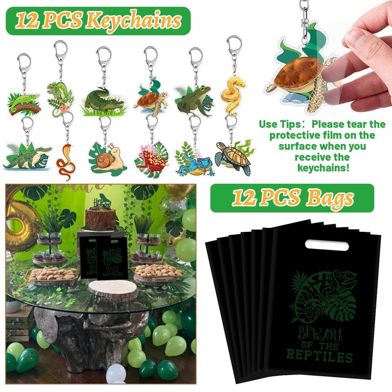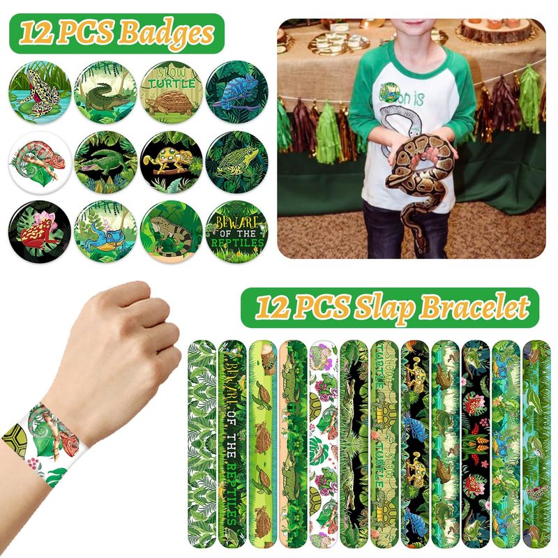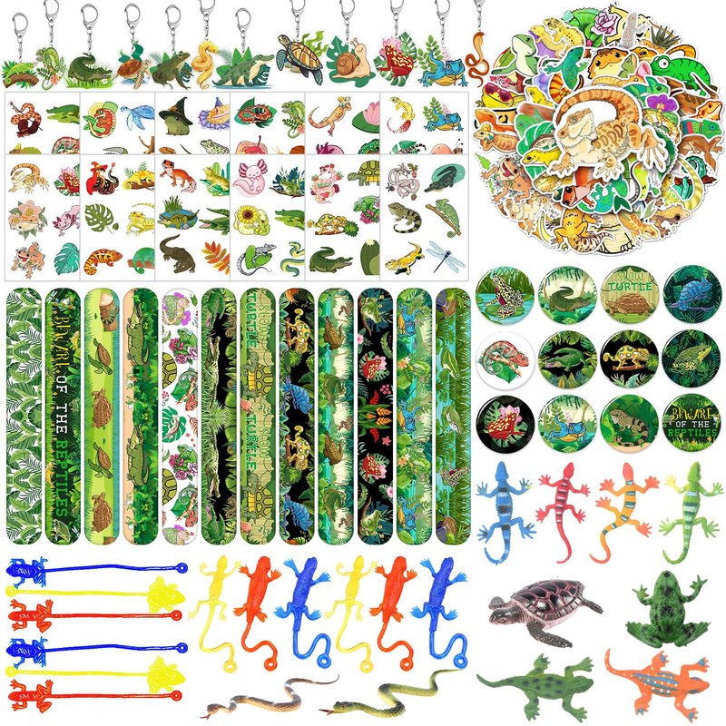 - What You Will Get: Our perfectly reptile party favors contains12pcs reptile slap bracelets,12pcs plastic reptile toys,12pcs reptile vinyl stretchy sticky toys,12sheet reptile temporary tattoos(72pcs), 12pcs reptile button pins, 50pcs reptile stickers ,12 pcs acrylic reptile keychains