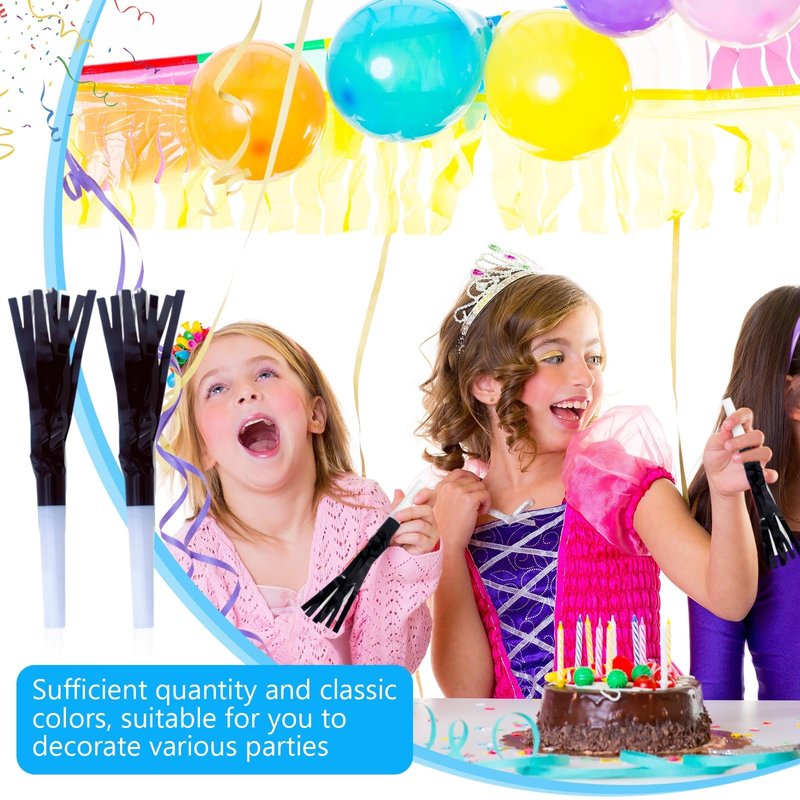 - Festive Party Favors: Set of 48 metallic fringed noise makers in a sleek black color, this set ensures you have enough noise makers for all your guests to join in the celebration, for perfect for baby showers, kids' birthday parties, and New Year's celebrations.