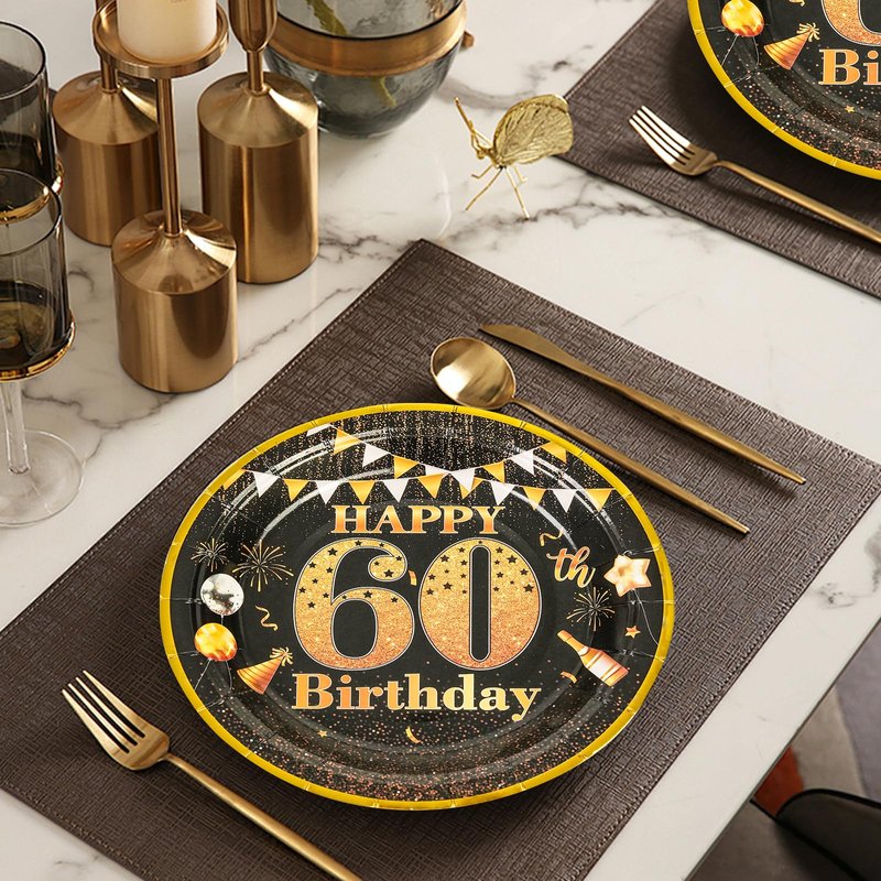 LDFDRT Party Paper Plates 60th Birthday Decorations 50 Pcs 7" Black Gold Birthday Plates Tableware Set Happy Birthday Party Supplies