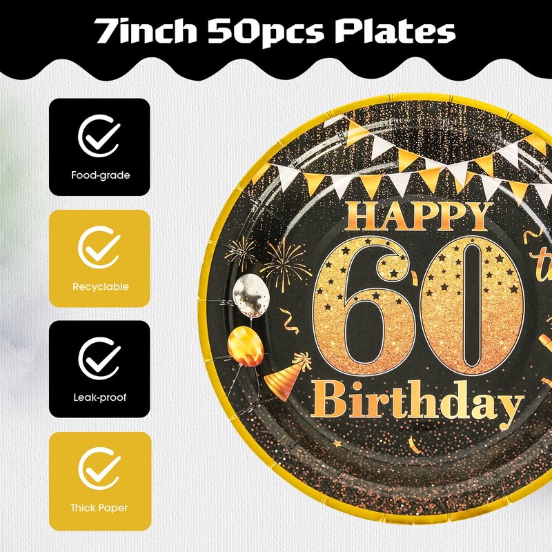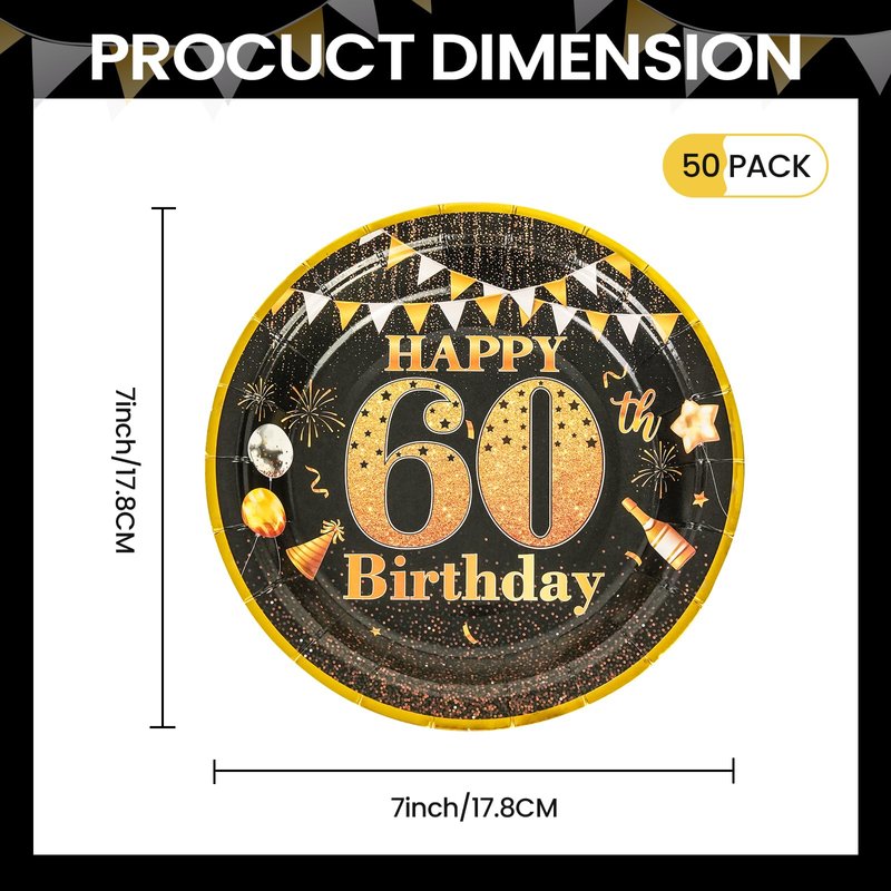 - Birthday Party Paper Plates:Our birthday party supplies come in 60th 7 Inch 50 PCS birthday paper dessert plates,Each white Birthday Disposable Plates Style measures 7Inch ,Total 50PCS.These birthday tableware are perfect for indoor or outdoor Parties Birthdays decorations, picnics, barbecues, various parties, and many other themed events.