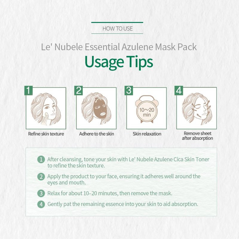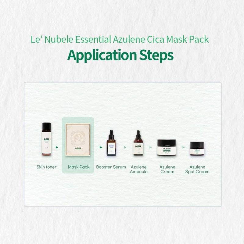 Le' Nubele Azulene Cica Mask Pack is a calming, non-sticky sheet mask for sensitive skin. With Azulene, Cica, and Sodium Retinoyl Hyaluronate, it soothes, balances oil, and strengthens the skin barrier. Clinically tested for daily use without causing irritation.