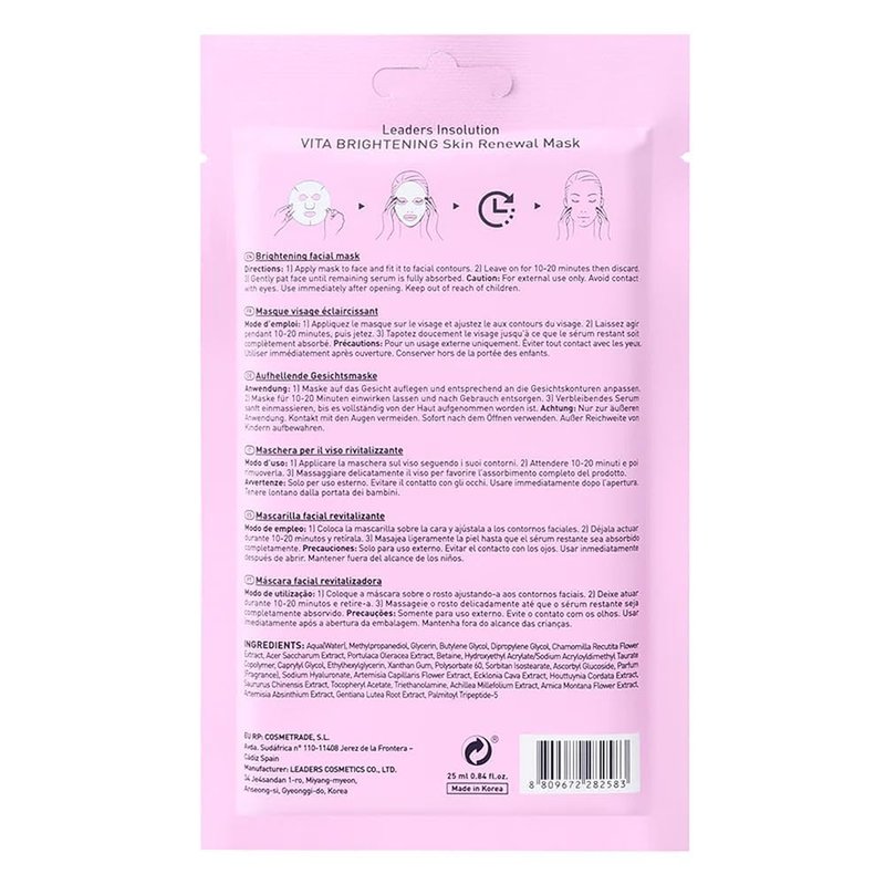 - LEADERS QUALITY ASSURANCE – Manufactured in South Korea by Leaders, a renowned skincare brand with its own R&D center and production facilities, each product undergoes rigorous testing to ensure the highest quality and effectiveness. Leaders Insolution Vita Brightening Masks are easy to use: Cleanse and prep skin with toner. Remove mask from the pouch and fit to facial contours. Leave on for 10-20 minutes for optimal results. Gently massage extra serum into face and neck until fully absorbed.