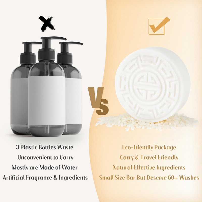 - 🌿 Plastic-Free, Zero-Waste Rice Shampoo Bar: Say goodbye to plastic bottles with our eco-friendly shampoo bar! Made with rice water for hair growth, this solid shampoo is packed in compostable, recyclable paper bags, reducing waste and supporting a greener planet. Perfect for those seeking a sustainable alternative to traditional shampoo and conditioner sets