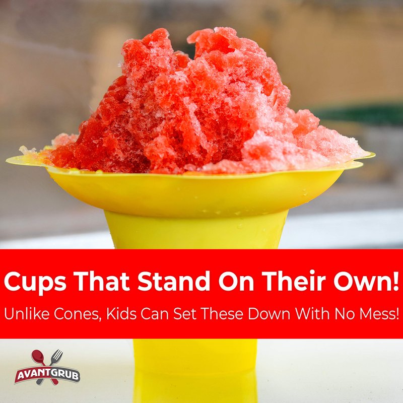 Unlike traditional paper snow cone cups, our plastic shaved ice cups have a flat bottom. This means they will stand on their own when set down, minimizing spills and sticky messes all over your house, guests and patio area! Not to mention, because they can be set down, they are much easier to use for refills all day long!