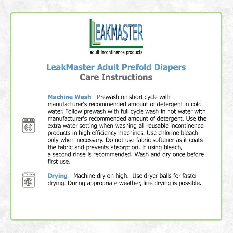 - WATERPROOF PANT ALSO REQUIRED – Adult prefold diapers are folded to fit and require diaper pins and a plastic pant to be worn over them to protect clothing and/or bedding from moisture. Please search for “LeakMaster Plastic Pants” to see a variety of plastic pant types to meet every need.