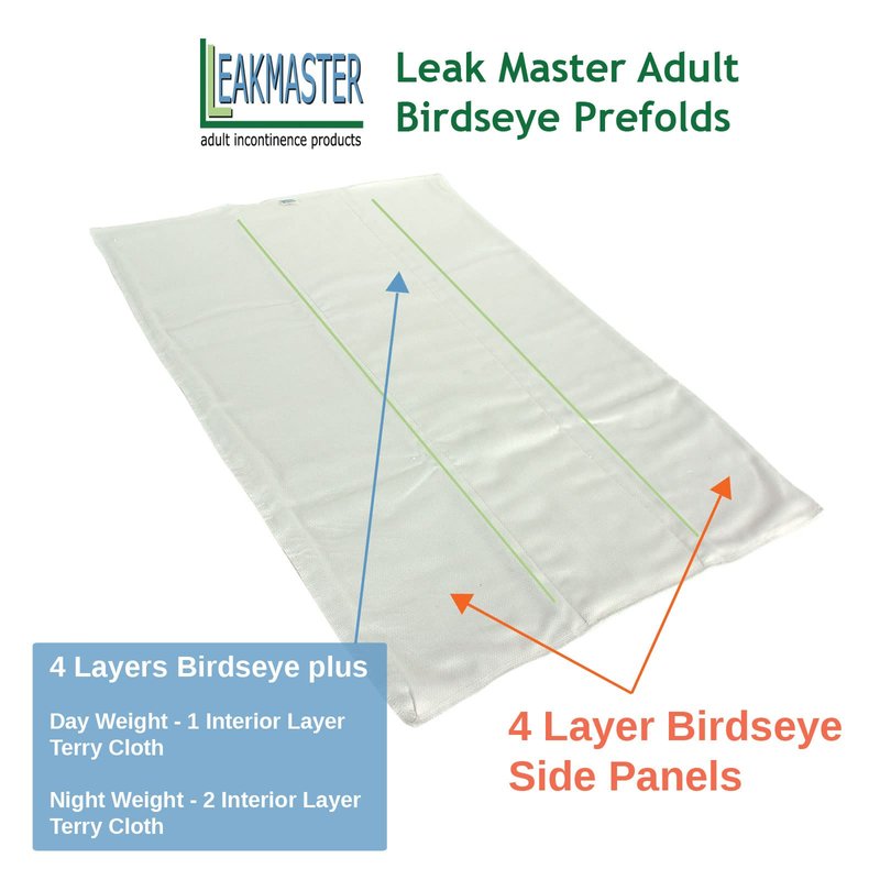 - BIRDSEYE PREFOLD CLOTH DIAPERS FOR ADULTS - Rely on LeakMaster's Adult Prefold Cloth Diapers that are quality sewn in the USA from 100% birdseye weave cotton for superior comfort and absorbency.