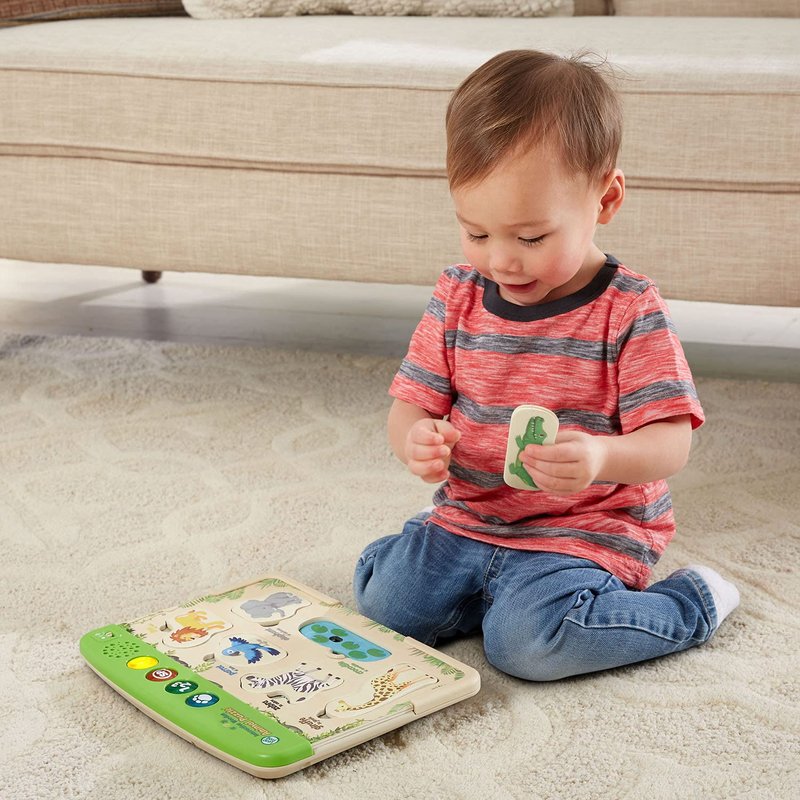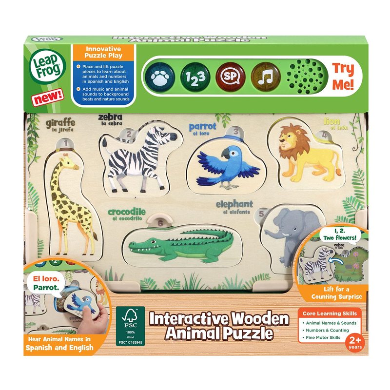 - Match six animal puzzle pieces by shape and color border; interactive puzzle responds with learning phrases when pieces are placed or removed