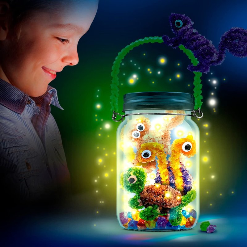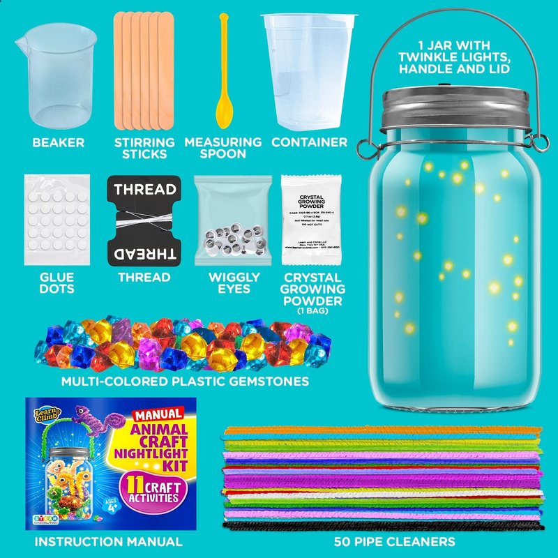 - ARTS And CRAFTS KIT FOR KIDS- with 11 craft activities! Kids will create animal shapes then watch them grow crystals! Display them in the jar with lights to craft your own custom nightlight!