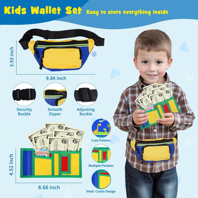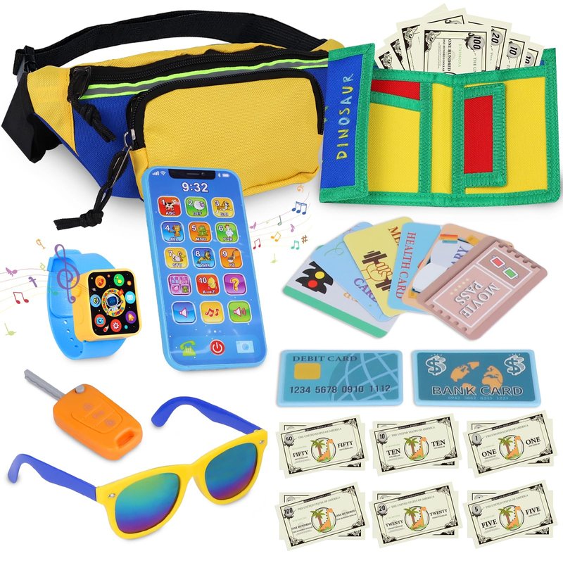 - My First Wallet Kit- Little kids love mirroring the world around them and purses for little kids are a way for toddlers to play grown-up and experiment with their personal style. Package Including- Waist Bag, Dinosaur Wallet, Watch, Phone, Key, Sunglasses, Pretend Cards x 8 and Fake Money x12 (1$, 5$, 10$, 20$, 50$, 100$, each x2 ).