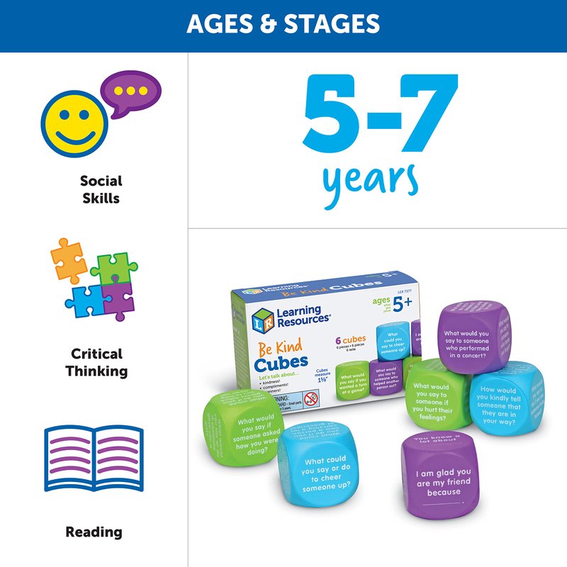 - Ages and Stages: Specially designed with little ones in mind, Be Kind Cubes help kids as young as 5 build essential SEL skills!
