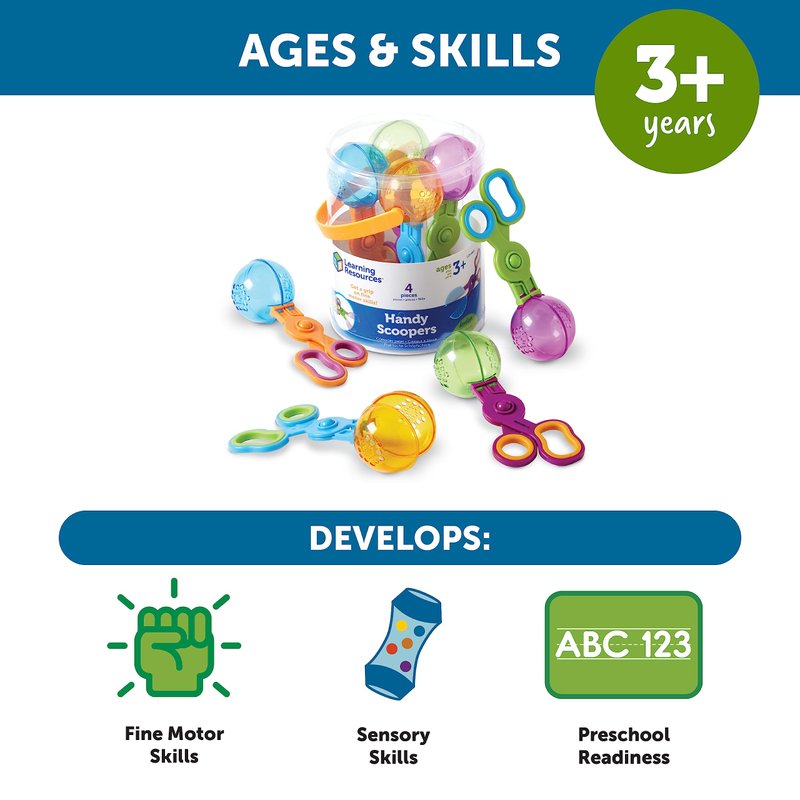 Learning Resources Handy Scoopers - 4 Pieces, Ages 3+ Toddler Learning Toys, Fine Motor and Sensory Toys, Sand Box Toys for Toddlers, Kid Tweezers