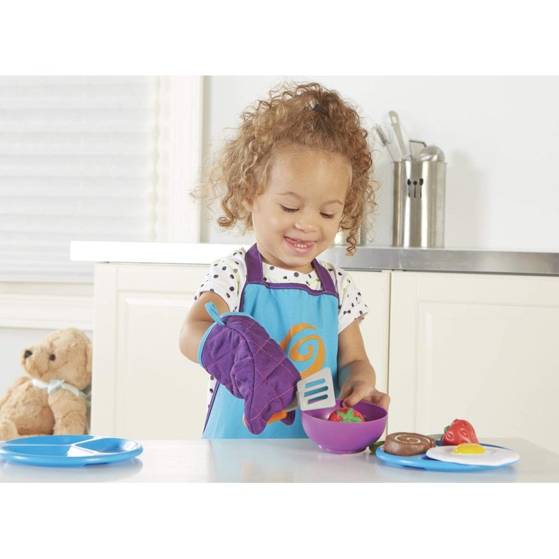 - Includes a toddler-sized apron, oven mitt, and a chunky, easy-to-hold plastic spatula and spoon