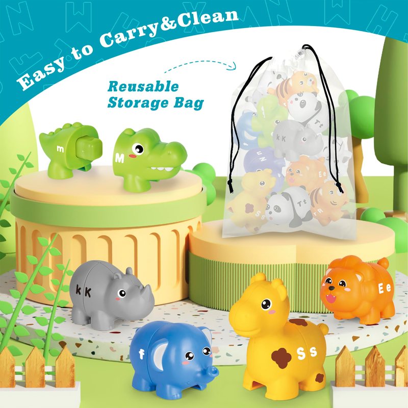 - 🛒【Alphabet Matching Set】The animal alphabet matching set comes in a value pack with 26 letters on 26 colorful animals. The animal take ten kinds:panda, giraffe, tiger, rhinoceros, elephant, fox, lion, crocodile, hippo, Leopard. Each animal bears two pairs of letters in both uppercase and lowercase. Cute alphabet animals are easy to put together, mix, match and store with a portable draw-string bag.