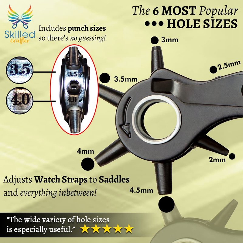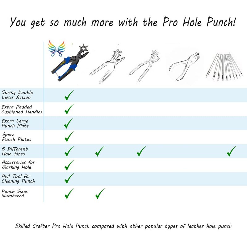 Do You Need the Perfect Hole Puncher to Make Precise Round Holes Easily and Professionally? The Pro Hole Punch is all this and more! Ideal for belts, bags, saddles, tack, shoes, pet collars, store cards and many different craft projects. We think you will love it! Professional quality with the strength and precision you demand, the Pro Hole Punch is designed to make light work of tough jobs. It will cut neat holes in many different types of material including leather, plastic, card and rubber - and with 6 different holes sizes to choose from and a large punch plate for stability it is ideal for most jobs. Hole size dimensions: 2mm, 2.5mm, 3mm, 3.5mm, 4mm and 4.5mm. The double lever mechanism means it takes the strain so you don't have to. You don't need to be strong to punch neat holes. The Pro Hole Punch has comfort grip handles made from durable and gentle pvc and is ideal for repetitive work. Metal handles can cause blisters and sore pressure points. Our handles are non slip and cushioned to help prevent damage and strain to your hands. BONUS 1 - You want a hole punch that will keep on punching precise holes for a very long time. Right? So you will receive 2 punch plates with screwdriver in a handy box that stores neatly between the handles. BONUS 2 - Your Free Awl is perfect for marking the correct position and for removing stubborn off-cuts from inside the tubes. BONUS 3 - Handy ruler included to precisely measure your material and eliminate the chance of making a mistake. BONUS 4 - 2 YEAR WARRANTY. We will send you a replacement if any part fails. We care about the environment. You will receive your Pro Hole Punch in Amazon approved Frustration Free Packaging.