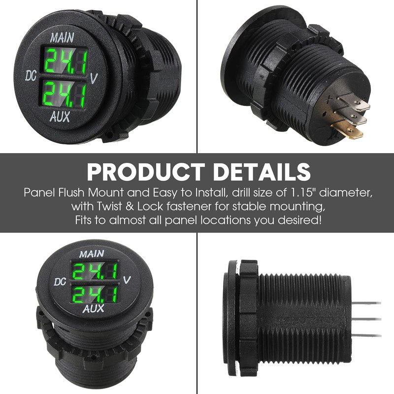 LED Digital Double Voltmeter, Round Panel Voltage Monitor for Car Pickup RV Truck Dual Battery Pack (Green)
