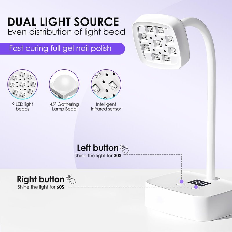 - TIMER MODE: This auto-sensing mini uv light for nails is timed to turn on/off with a long press, and with a tap of the button, it can show 2 timer modes of 30 seconds/60 seconds on the display, which can accurately cure all kinds of nails.