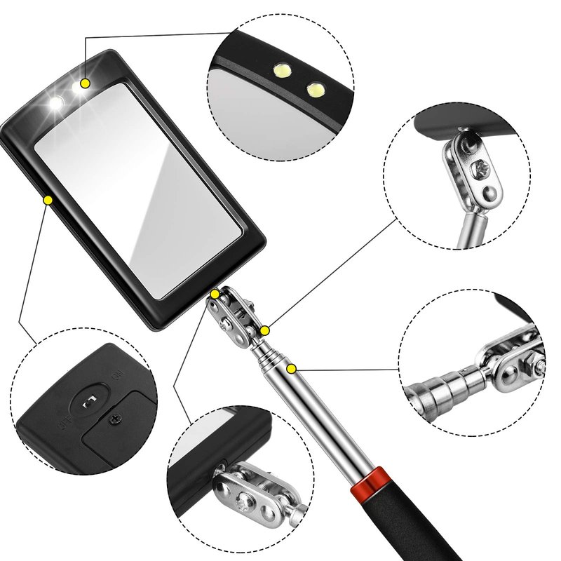 - Easy to use: it is very suitable for tool manufacturers, mechanics, inspectors, dentists, makeup artists and mechanics to enter areas, corners and crevices that are difficult to reach; The telescopic rod is easy to extend and retract, and the rotating neck mirror allows you to adjust the position of the mirror and observe each small area