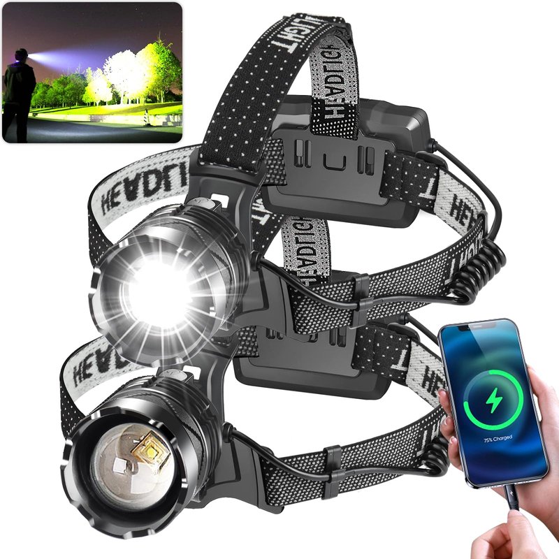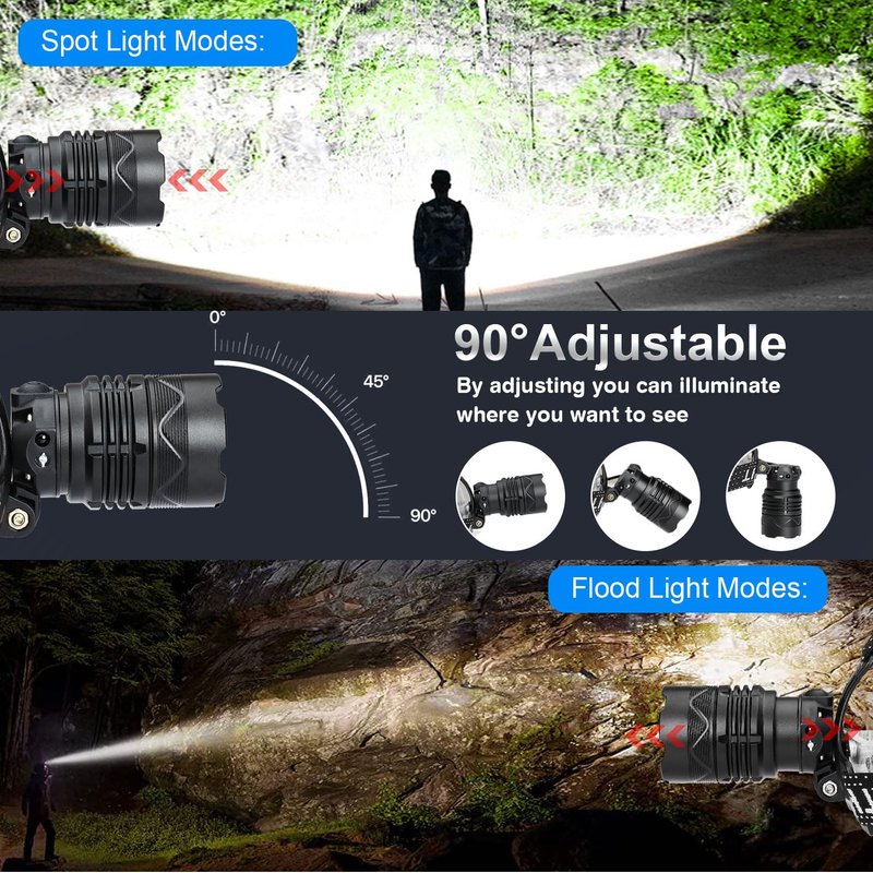 - 【HIGH LUMEN HEADLAMP】Upgraded with vertical LED chips, it is brighter than rechargeable headlamps on the market with fewer headlamp wicks. Even up to 120000 lumens is not easy to get hot, more safe and reliable; presents an even illumination light, making the headlight's long-range distance stronger, projecting distance up to 4,921 ft (1,500m) long-range light