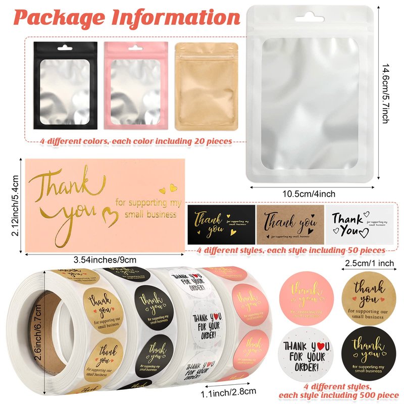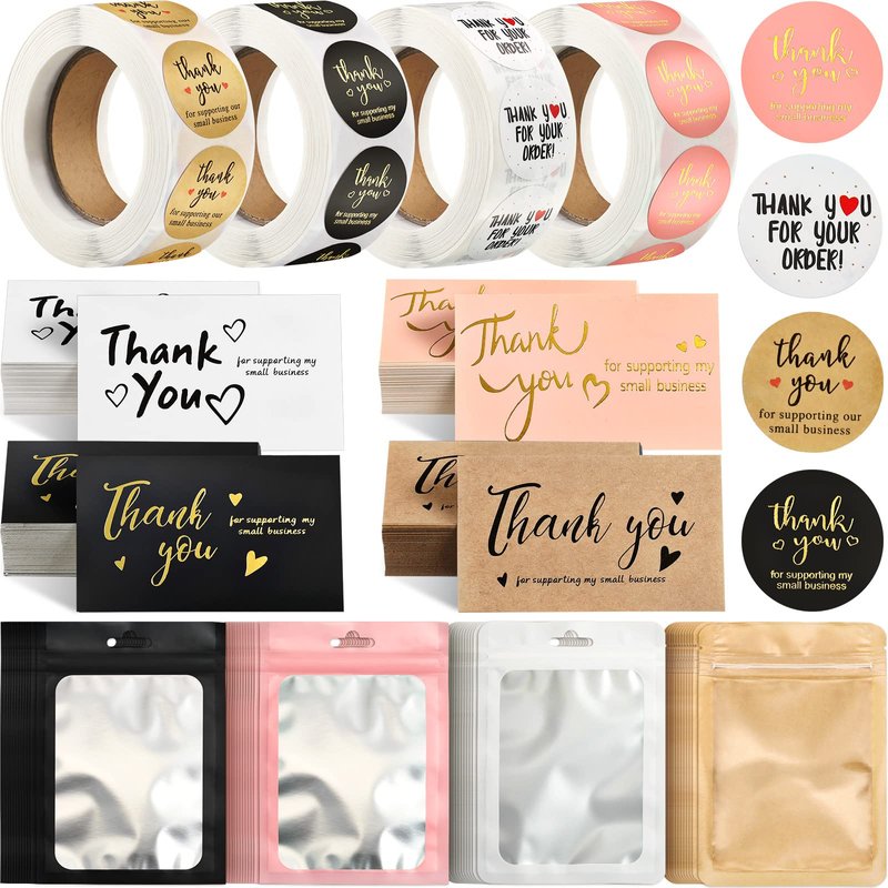 Leelosp 2280 Pcs Thank You Cards and Stickers Set Small Business Packaging Supplies Easter Gift Thank You for Supporting My Small Business Sticker Resealable Bag Card(Black, White, Gold, Pink)