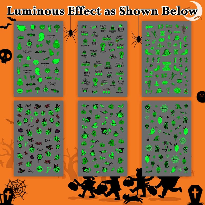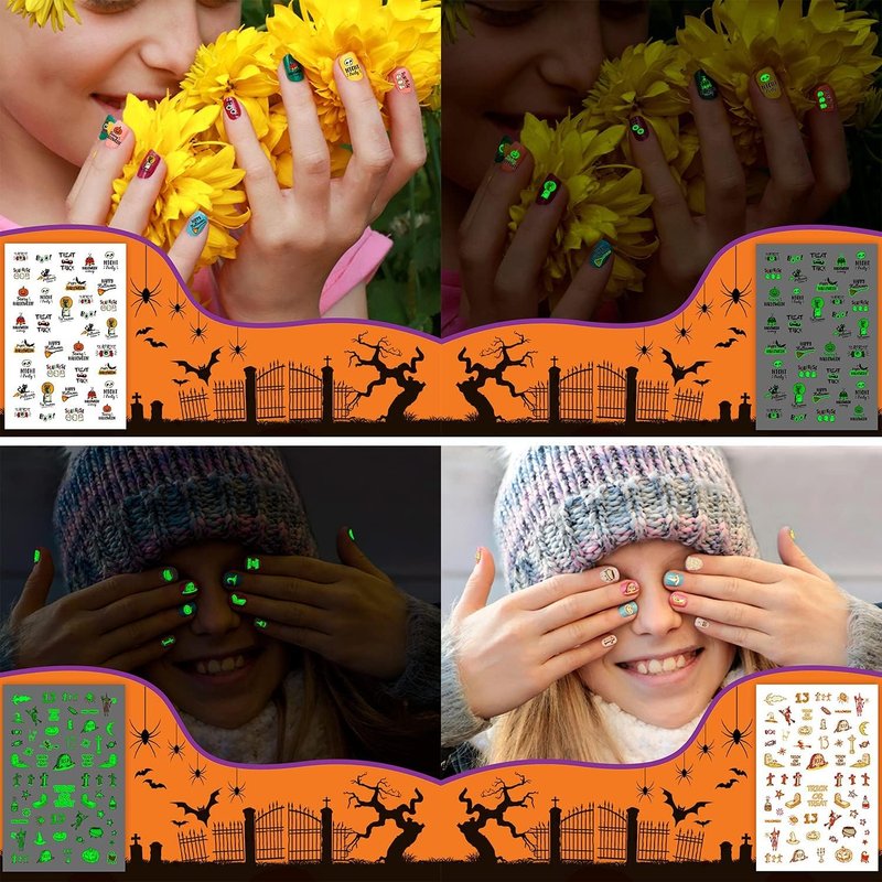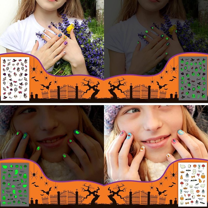 - 【Glow Halloween Theme Nail Stickers】6 sheets Glow Halloween nail stickers with over 280 designs, including ghosts, witch hats, cats, pumpkins, eyes and more! Make a Halloween nail art with it and give your kids, girls and your friends a colorful and fun Halloween party!