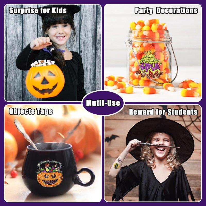 - Glitter Designs: 50Pcs glitter kids tattoos stickers are adorned with mesmerizing sparkles that add an enchanting touch to any Halloween party. Includes pumpkin, bat, black cat, witches, and various other elements.