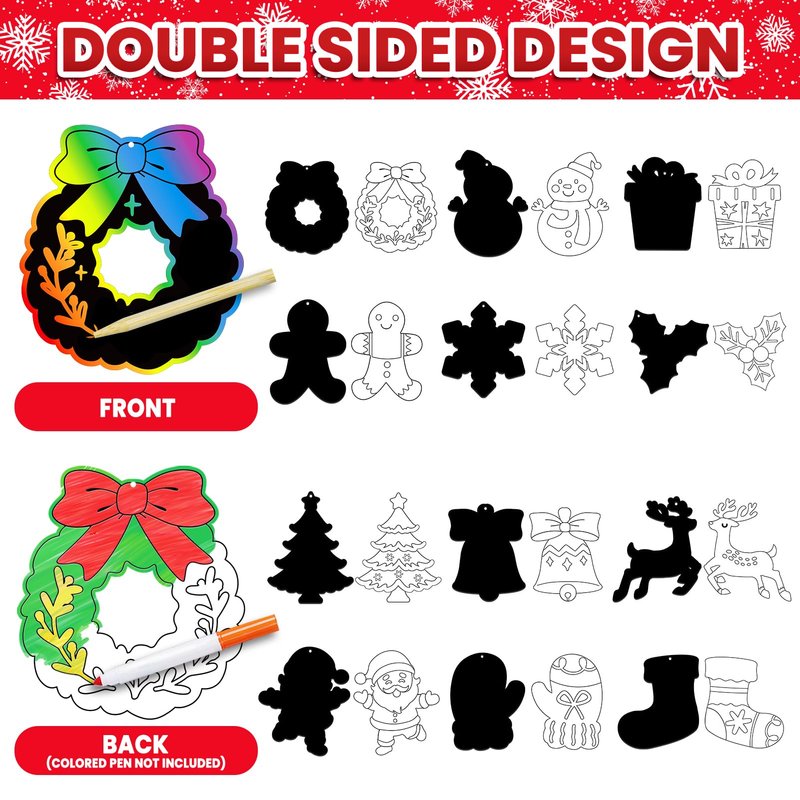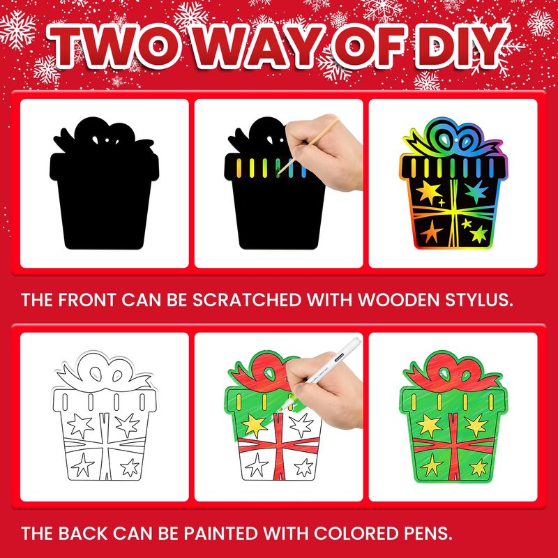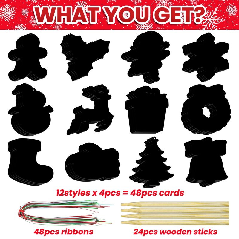 - Christmas scratch cards are available in two quantities: 96pcs or 48pcs. Christmas scratch paper art set includes 12 different shapes of Christmas scratchcards (96pcs/48pcs), decorative ribbons and wooden sticks.