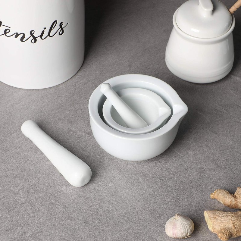 - [Ceramic material]-Unlike wooden materials, ceramic materials will not be moldy or hairy. If stored carefully, this Mortar and Pestle set can survive for many years.