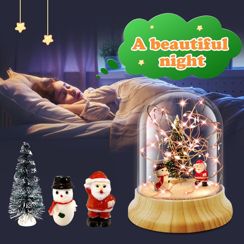 - SET INCLUDES: Arts and crafts night light include 1 USB cable, 1 Santa claus, 1 Christmas snowman, 1 Tree, 1 Packet of white tree powder, 1 crystal jar, 1 LED string light, 2 double-sided nano-adhesive, create to belong to your own night light. Creative handmade light is very fun crafts that are loved by all ages.