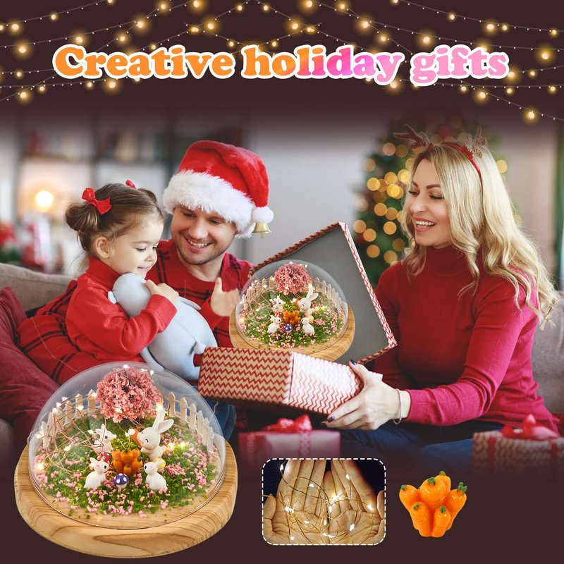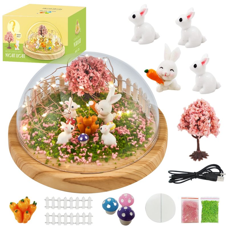 - SET INCLUDES: Arts and crafts night light include 1 USB cable, 1 Radish rabbit, 3 Little rabbits, 1 Tree, 1 Radish, 3 Mushrooms, 2 Packet of tree powder, 2 double-sided nano-adhesive, 1 crystal jar, 1 LED string light, 2 Pieces of fence, create to belong to your own night light. Creative handmade light is very fun crafts that are loved by all ages.