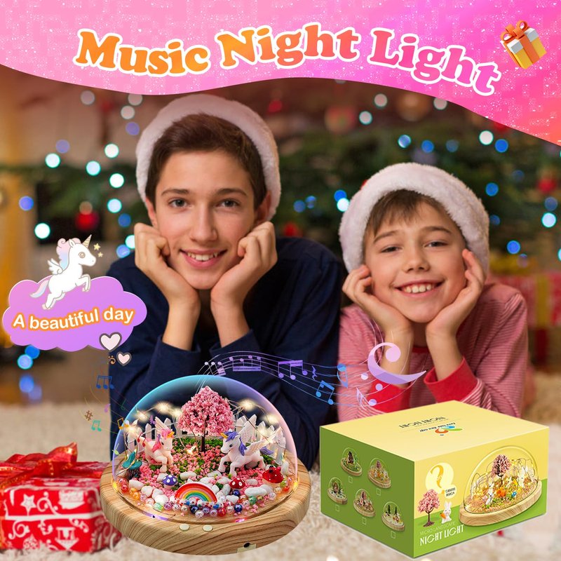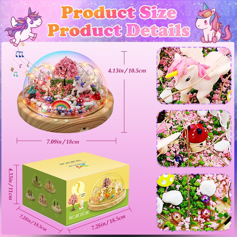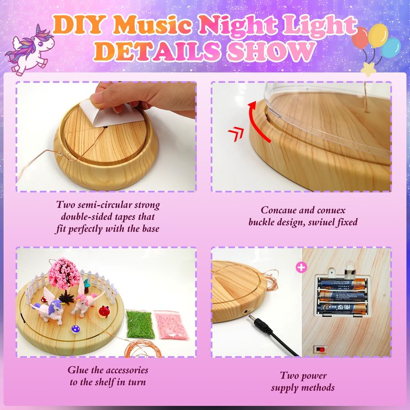- EASY TO OPERATE: DIY music night light decor, press the right button to turn on the colorful LED fairy lights, press the left button to play more than 10 pieces of music in a loop, operation steps are simple, easy to assemble, no experience required. Operation steps: you need to stick the film, paste the small accessories, wind the filament, and close the lid, you can enjoy the beautiful scenery brought by Unicorn toys, the fairy-tale lighting creates a warm atmosphere.