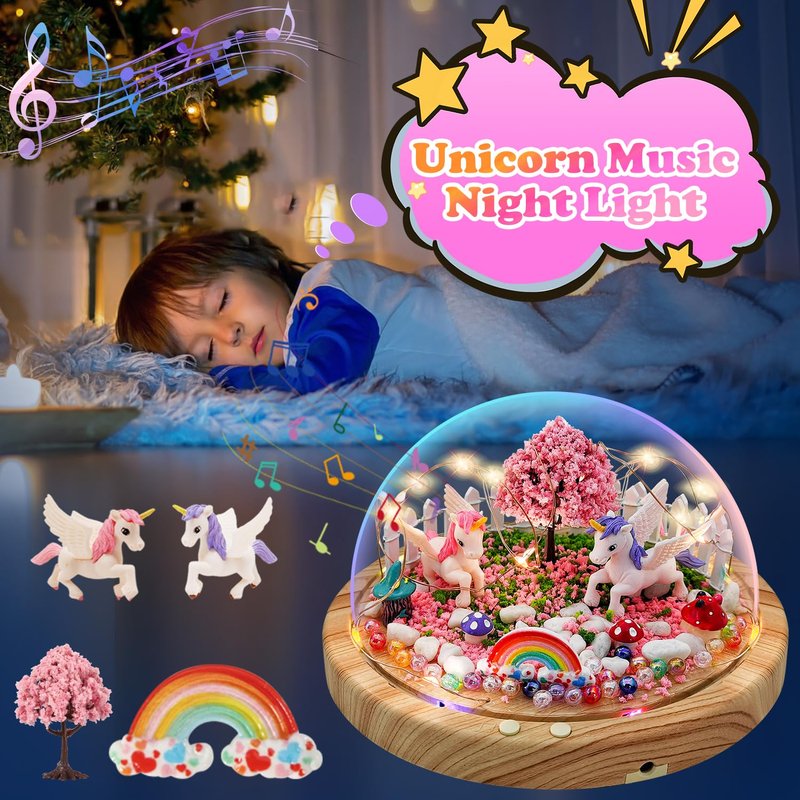 - SET INCLUDES: Arts and crafts night light include 1 USB cable, 2 Unicorn, 1 Rainbow, 1 Tree, 4 Mushrooms, 2 Packet of tree powder, 1 Packet of colour pearls, 1 Packet of white pebbles, 2 double-sided nano-adhesive, 1 music crystal jar, 1 LED string light, 2 Pieces of fence, create to belong to your own night light. Creative handmade light is very fun crafts that are loved by all ages.