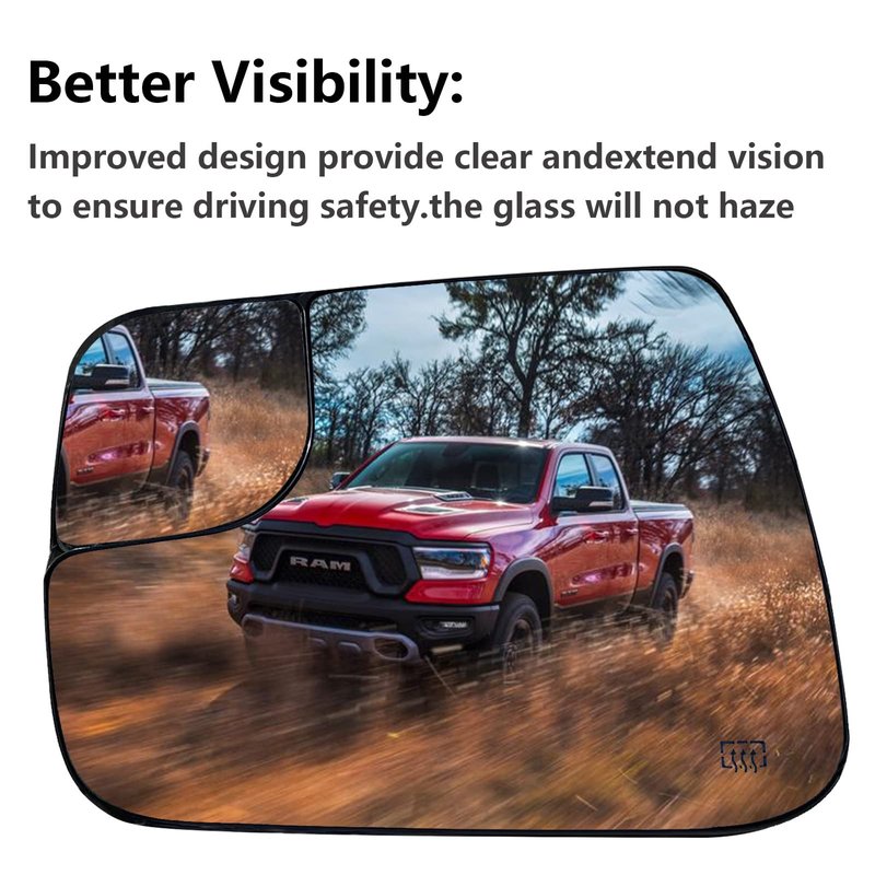 - 【Heating Function】: The ram 1500 side mirror has heating function which provide a clear vision to ensure driving safety. When in the rain and snow day, driver can turns on the electric heating function of the mirror glass, and the electric heating element will quickly heat to a fixed temperature within a few minutes, defogging and defrosting.