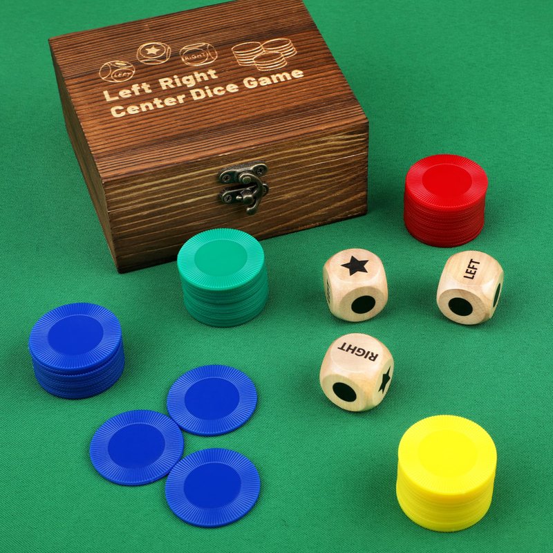 - 【Colorful Dice Chips】 Inside the set, you'll find three 1-inch wooden dices adorned with the left right center theme, adding a touch of charm to your gaming experience. Additionally, the set includes 48 plastic chips in vibrant red, yellow, blue, and green colors, with 12 pieces of each color, providing ample resources for gameplay.