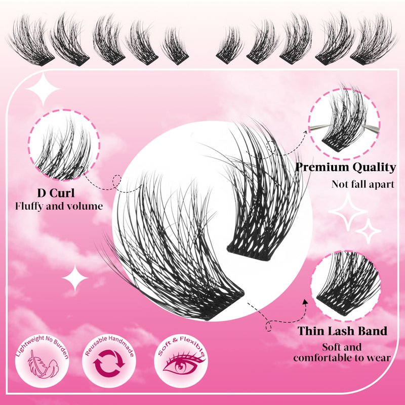 - 【Pre-matched Clusters for Easy Application】: These lightweight pre-made lash clusters make it super easy for beginners to apply and get a perfect look.These cluster lashes save you a lot of time compared to regular lash clusters, making them a quicker option. Plus, You can mix in other lash clusters you often use to create your favorite style!