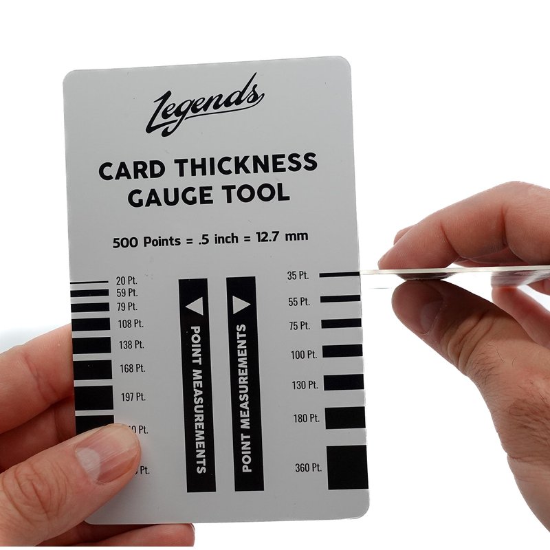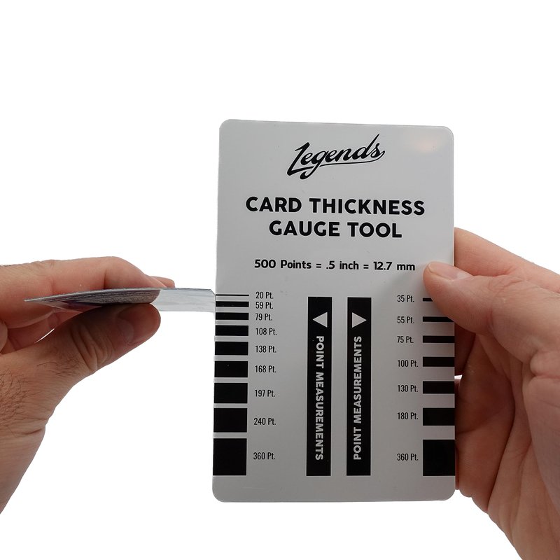 The Thickness Gauge Tool is east to use. Simply hold your card up to it starting at the top. If the card you are comparing is thicker than the black line on the tool, keep moving down until the card thickness matches one of the black lines. Once you know the thickness of your card, make sure to store it in the correct size protective case for safekeeping.