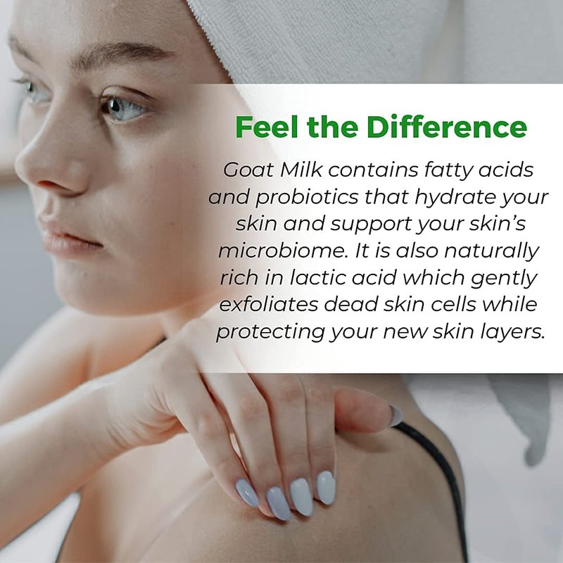 - THE SKIN BENEFITS OF GOAT MILK : Goat milk works wonders for your skin. Enriched with fatty acids and probiotics, it nourishes and hydrates, fostering a healthy skin microbiome. Additionally, its natural abundance of lactic acid gently sloughs away dead skin cells, safeguarding and promoting the emergence of fresh, revitalized skin layers.