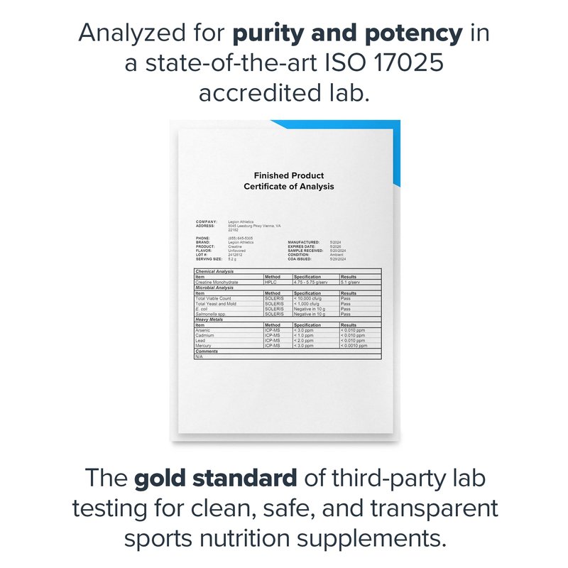 - Micronized Creatine Monohydrate Powder: Achieve your fitness goals & optimize your muscle recovery with unflavored creatine from LEGION; With a clinically effective dose of creatine monohydrate this creatine powder can help boost muscle mass, improve endurance, and reduce soreness after your workout.