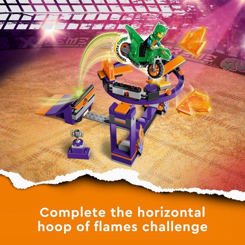- Includes a LEGO City Stuntz ring that can be inserted in horizontal or vertical position, ramp, trophy, flywheel-powered stunt motorcycle and a minifigure