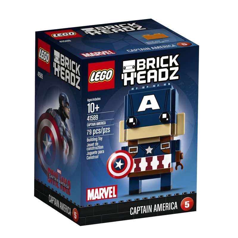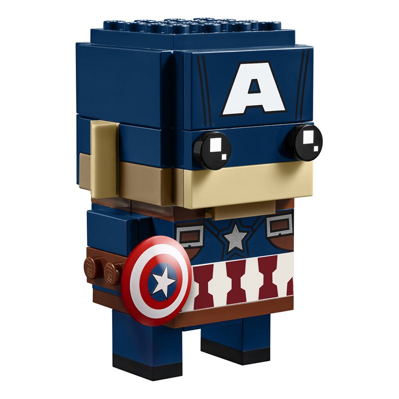 - Buildable Captain America LEGO BrickHeadz construction character features colorful and authentic detailing, BrickHeadz eyes, detachable shield, plus a display baseplate