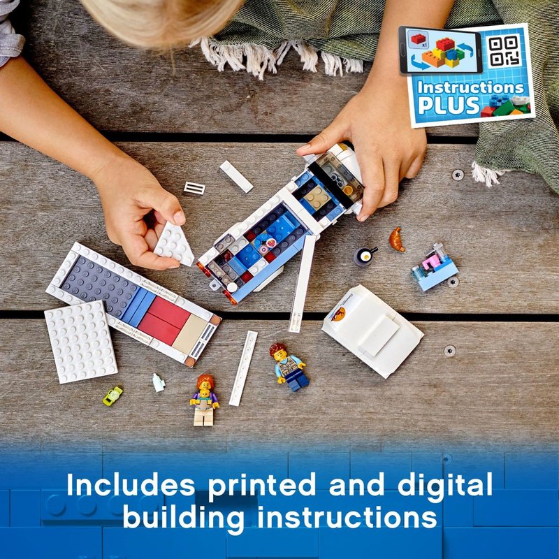 - This toy for kids 5+ years old includes a baby, Mum & Dad minifigures, and the LEGO caravan settings include a table, kitchenette and sleeping area