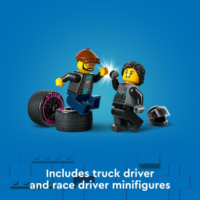 - LEGO transporter model – Kids can lower the race truck’s ramp to load up the race car toy before heading to the nearest racetrack for exciting truck vs. car race action