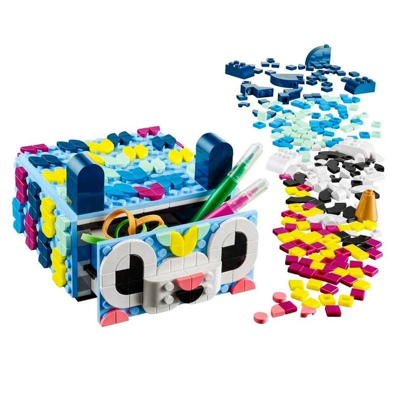 - LEGO DOTS Creative Animal Drawer mosaic kit for children ages 6 plus features a box with a working drawer and storage space plus colored DOTS tiles