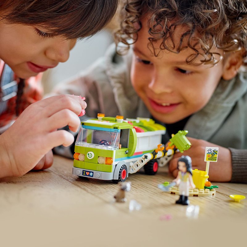 - Educational Recycling Toy - This toy features a garbage truck with removable bins, tipping function, and seats for 2 LEGO Friends mini-dolls and a racoon figure!