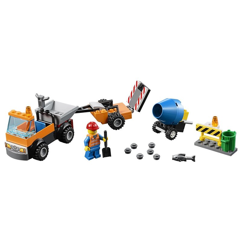 - Build a sturdy road repair truck toy with open back for tools and road block toy, a detachable trailer with ramp and cement mixer