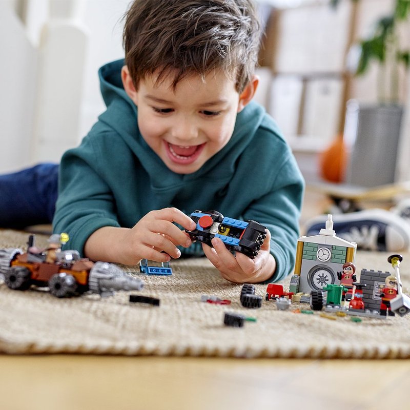 • Build a bank vault with breakaway door and a street scene with wall and buildable streetlamp, plus an Incredibile vehicle and Tunneler machine with spinning drill bits